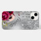 Faux silver glitter drip, paint dripping look on a faux silver metallic looking background. Burgundy, pink and rose gold coloured Flowers. Personalize and add a name. The name in black is written with a modern and trendy hand lettered style script.