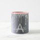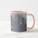 A girly and trendy monogrammed mug. A chic faux silver looking background decorated with faux glitter drips, paint dripping look. Personalize and add a name and monogram letter. White and grey coloured letters. The name is written with a modern hand lettered style script with swashes. To keep the swashes only delete the sample name, leave the spaces or emoji's in front and after the name.
