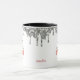 This mug has a happy snowman face on two sides. The top is bordered with sparkly silver glitter drips. Your name or other text is located between the snowman faces. Cute for Christmas and all through the winter.