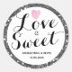 Personalized silver glitter love is sweet sticker with a pink watercolor heart above the love is sweet message. You'll be able to easily personalize with names and the date. There is a silver glitter design around this beautiful love is sweet sticker. It would make a sparkling touch to your beautiful wedding, shower, anniversary and more.