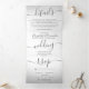 Silver glitter ombre white script chic wedding tri fold invitation with the details, main invitation, and the rsvp for your guest to cut and return. Add your photo at the back. Featuring a chic grey silver glitter ombre on a white simple background with an elegant and modern script calligraphy font.