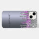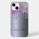 An elegant, girly and glam case. Faux silver and purple faux glitter drip, paint dripping look. Chic dark faux silver metal looking background. Personalize and add your name. The name is written with a modern hand lettered style script. Black letters. To keep the swashes only delete the sample name, leave the spaces or emoji's in front and after the name