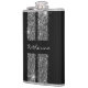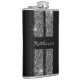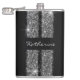 Faux dark silver sparkly glitter effect racing stripes on a personalized flask with custom printed name text on one side.