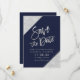 Silver typography on customizable navy blue silver glitter colour block, and faux silver geometric stripes chic save the date wedding , perfect for elegant, stylish wedding,