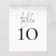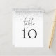 A size 4.5 x 5.6” semi-gloss 110lbs weight, which is of similar thickness to a postcard, with ONE per sheet. Silver Glitter Script Wedding Table Number. An elegant design with table in a set handwriting style script and your table number beneath. Easily personalise the number. A silver faux glitter border runs along the top edge. The same design is on the other side.