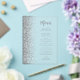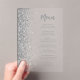 The left-hand edge of this elegant modern wedding menu features a faux silver glitter border. The customizable text combines grey handwriting script and sans serif font on a clear background.