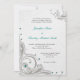 This stylish elegant wedding invitation has a silver glitter flourish swirl design at the bottom left and top right. There are jewel embellishments that are dark aquamarine green/blue coloured. In the middle, you can easily customize your wedding ceremony information. PLEASE NOTE, the jewels are FAUX, not a real embellishment, they are just part of the design. This trendy invite would work great for a winter wedding.