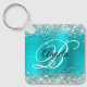 Silver Glitter Turquoise Blue Foil Fancy Monogram Keychain