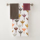 This towel set has a pink gold washcloth, a platinum hand towel, and a bath towel with a Boho design of three leaves together with three dots below them in silver, gold, brass, platinum, and pink gold.