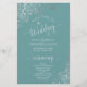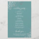 These wedding programs are elegant and tasteful, while still being budget friendly. The design features ornate silver grey faux foil lace with pale grey text on a teal or turquoise coloured background. The typography features lacy script calligraphy, and there is room for details on the ceremony, the bridal party, and a short thank you.