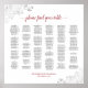 This beautiful wedding seating chart features red and grey text on a white background with seating assignments for 200-240 guests. It features a simple yet stylish and elegant design with ornate decorative faux foil silver filigree in the corners. The title is written in fancy script calligraphy and reads: Please find your table.