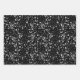 Pretty trio of wrapping paper sheets feature a silver glitter leaves pattern overlay with black, dark grey and light grey backgrounds.