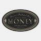 "Honey" is printed in a chiseled shimmery silver metallic font with drips. Two heraldic bees are placed on either side of the word "honey".