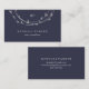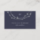 These stylish business cards feature a dark midnight blue background, with a faux silver circular wreath hanging down from the top of the card. Personalize with all of your information in light grey text.