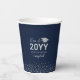This modern graduation party paper cup features silver typography "Class of 20YY (graduation year)" and a graduation cap graphic with a confetti background. You can customize the text. More colour options and party supplies are available at my shop BaraBomDesign.