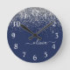 Silver Navy Blue Girly Glitter Sparkle Monogram Round Clock