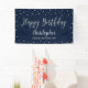 This stylish birthday banner design features silver "Happy Birthday" typography on a navy blue background. You can personalize name & year text and the background colour. More party stationery and event decoration items are available at my shop BaraBomDesign. Thanks!