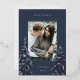 A modern and elegant Christmas holiday card design featuring a single vertical photo on a navy blue background. Two tall pine trees frame your photo, adorned with silver foil detailing. Personalize with your custom holiday greeting, family name and the year.