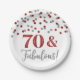 70 and fabulous birthday party plates with silver and Red glitter pattern confetti.
