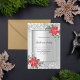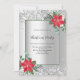 Fond argenté faux décoré de poinsettias rouges, feuilles vertes, confettis. Personnalisez et ajoutez les détails de votre fête. Lettres noires.