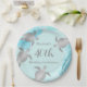 This elegant paper plates for a birthday at the beach features silver turtles on a turquoise blue ink background and a custom text in an elegant script.