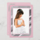 A trendy, new design pairing pink with a silver shimmer trim. Just add your little girl's photo and customize. The words in front and the cross in the back can be dragged to any location. They can be made larger or smaller (+-) or eliminated.