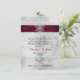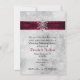 Elegant winter wedding rehearsal dinner invitation done in a white and light grey sparkly looking background. Graphics of a rich ruby red satin looking ribbon with white lace edges, runs across the top of the invitation and is decorated, in the middle, with a silver tone and diamond looking snowflake jewel. Personalize the black and red text to suit your needs. Chose from many different card stock options for the look you like best.