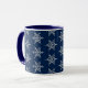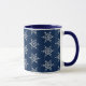 Mug in a pattern of iridescent silver snowflakes on a deep, midnight blue background