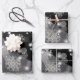 Winter themed wrapping paper sheet design featuring faux silver snowflakes, sparkles and lights on a black background.