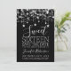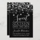 Silver & Black Sweet 16 Birthday Sparkly String Lights "Save the Date" announcement template with party address and RSVP details.