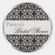 An elegant silver colour swirls on a black background with a grey band to personalize with your message.The silver effect border frame gives a designer and chic touch to the round stickers for your bridal shower invitations and favours.