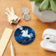 Here is a pretty keychain that features a silver silhouette of a rearing unicorn, with a star sparkling blue night sky behind it. Her name is also in silver on a semi-transparent band that runs across the bottom of the image. The back is matching dark blue, with two fields for your custom text.