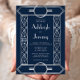 This elegant vintage-inspired wedding invitation features silver grey text on a navy blue background, framed by a stylish vintage geometric art deco border in faux silver foil. The reverse side is solid navy blue.
