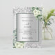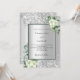Faux silver looking background decorated with white florals, flowers, eucalyptus greenery and confetti. Personalize and add your names and wedding details. Black letters.