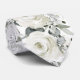 A white wedding tie featuring watercolor painted white florals of peonies and roses with silver eucalyptus greenery.