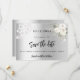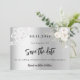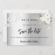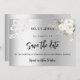 A modern and elegant Save the Date for a wedding. A faux silver looking background, decorated with white roses, flowers and white lace. Personalize and add a date and your names. The text: Save the Date is written with a large trendy hand lettered style script.