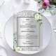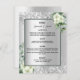 Personalize and add your names, date and the wedding menu. Faux silver looking background, decorated with white flowers and greenery, confetti.