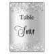 The table number is written with an elegant hand lettered style script. Black letters, a white background on front and faux silver background with faux glitter dust, sparkles on the back.