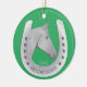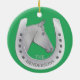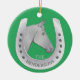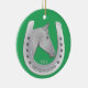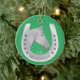 An ornament with a classic horse and horseshoe emblem with a dimensional look personalized with your family name or you can use a first name or your horse's name instead. An equine accent for your holiday celebrations. Makes a great gift for horse lovers, horse owners and horse racing fans. Silvery grey colours echo the colour of horse shoes. Classic, Elegant. Beautiful and Fun Equestrian Style.
