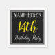 This simple and elegant paper napkin design features a message like "Name-Here’s 14th Birthday Party", with the "14th" in fancy yellow-coloured text, within a black-coloured square area featuring a simple border outline. The name can be customized. Napkins like these could perhaps be used at a birthday party for somebody who is celebrating their fourteenth birthday. [~Z0000150]