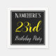 This simple and elegant paper napkin design features a message like "NameHere’s 23rd Birthday Party", with the "23rd" in fancy yellow-coloured text, within a black-coloured square area featuring a simple border outline. The name can be personalized. Napkins like these could perhaps be used at a birthday party for somebody who is celebrating their twenty third birthday. [~Z0000150]