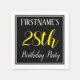 This simple and elegant paper napkin design features a message like "FirstName’s 28th Birthday Party", with the "28th" in fancy yellow-coloured text, within a black-coloured square area featuring a simple border outline. The name can be customized. Napkins like these could perhaps be used at a birthday party for somebody who is celebrating their twenty eighth birthday. [~Z0000150]