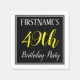 This simple and elegant paper napkin design features a message like "FirstName’s 49th Birthday Party", with the "49th" in fancy yellow-coloured text, within a black-coloured square area featuring a simple border outline. The name can be personalized. Napkins like these could perhaps be used at a birthday party for somebody who is celebrating their forty ninth birthday. [~Z0000150]