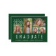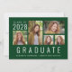 Simple green graduation announcement featuring a 5 picture photo collage and "Graduate" written across the bottom in large white letters. Add the class year, name and school or university in simple white typography.
