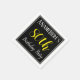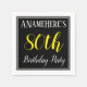This simple and elegant paper napkin design features a message like "ANameHere’s 80th Birthday Party", with the "80th" in fancy yellow-coloured text, within a black-coloured square area featuring a simple border outline. The name can be customized. Napkins like these could perhaps be used at a birthday party for somebody who is celebrating their eightieth birthday. [~Z0000150]