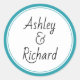 Simple and elegant names teal and white wedding Classic Round Sticker. It displays your names on white with a teal border. It coordinates with our "teal tropical leaves" wedding collection.