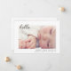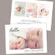 Minimal gender-neutral birth announcement featuring your baby's photo overlayed with "hello" in a simple script and their name, birth date and birth stats in modern typography. On the back, add three additional pictures and a personalized message.