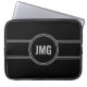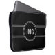 You can personalize the silver monogram that's in the centre of this black laptop sleeve. The text is inside of a black circle that has a double border. The circle's borders are silver. Four silver lines go across the sleeve.