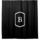 This black shower curtain has an initial that you can change to show the correct monogram. The letter is white and is framed.
