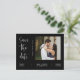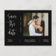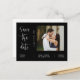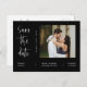 This save the date engagement announcement invitation postcard features an elegant calligraphy and simple sans serif typography font on a black background with a photo and QR code for a clean minimalist and modern look, which is a beautiful way to inform about your upcoming wedding. The simplicity of this design adds a touch of elegance to your wedding save the date invitation cards. It works well with many wedding themes and definitely a great addition to your wedding. Just customize the names and wording in a few easy steps and personalize the invitation postcard with your photo of the happy couple and replace the QR Code with yours on the back to give your postcard a nice personal touch.